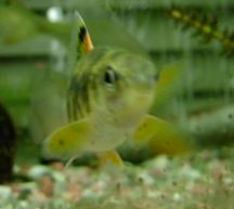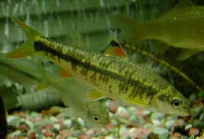 <観察記> 体はスマートで、やや金色に黒の筋、そしてオレンジのヒレ 清流魚っぽい、綺麗な魚だな〜〜が第一印象。 水槽に入れると、とにかく臆病でした。 餌をあげても、他の魚が来たら、すっと水草に隠れる 餌にもありつけない。 カメ見たいな弱弱しい顔が余計に心配をそそる。